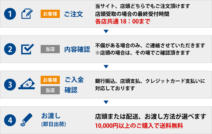 WEBサイトからのご注文、店頭でのご注文どちらも流れに大きな違いはございませんが、サイトからのご注文の場合、ご注文内容に不明点や不備がありますと、メールかお電話にてご連絡させていただき、内容が確定してからの受注となりますので、ご注意ください。
